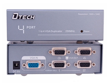 Bộ chia VGA Dtech DT- 7254 1 ra 4: Cho phép bạn chia tín hiệu từ laptop,PC ra 4 màn hình, máy chiếu, TV. Dễ dàng sử dụng và điều khiển.